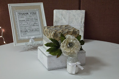 I personally didn't find the notion of a guest book all that appealing. Just a book that will sit and collect dust in a box. Instead, I took an old Panera delivery box that held sandwiches to one of our office luncheons and covered it in a white floral satin and added sticker pearls and rhinestone lace to it. Filled it with Moss I purchased online from AliExpress. I bought the stones at Home Depot (which were washed well before using). I took Sharpie pens and wrapped it in floral wire and added Paper Coffee Filter Flowers (after dying them in watercolor) to the top. The mirror frame was spray painted and then a pearl ribbon ribbon was applied to the inner section of frame and then rhinestone ribbon was glued around Vellum sign. I printed a poem on Vellum paper and hot glued it to the mirror. The jar the flower pins are in is just a small 2x2 square glass jar that I attached a Rhinestone ribbon with a satin bow on the front.